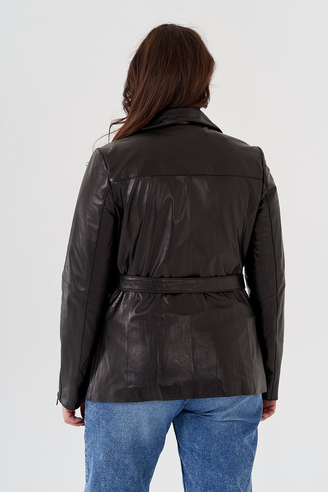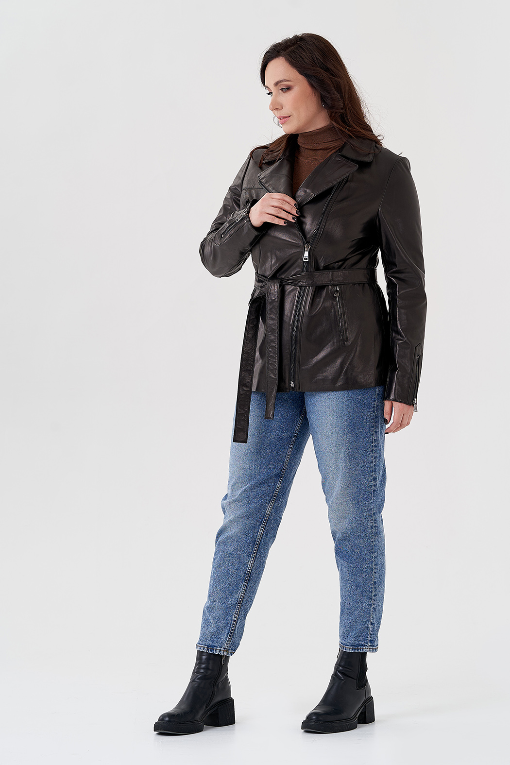Стильная приталенная куртка из натуральной кожи в классическом черном цвете. Акцентный трансформирующийся английский отложной воротник и стильный пояс делает эту модель незабываемой. Куртка дополнена молнией и удобными карманами. Отлично сочетается с юбками миди и брюками.