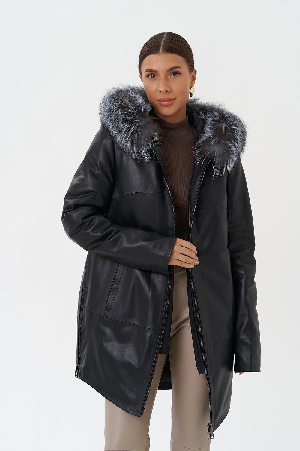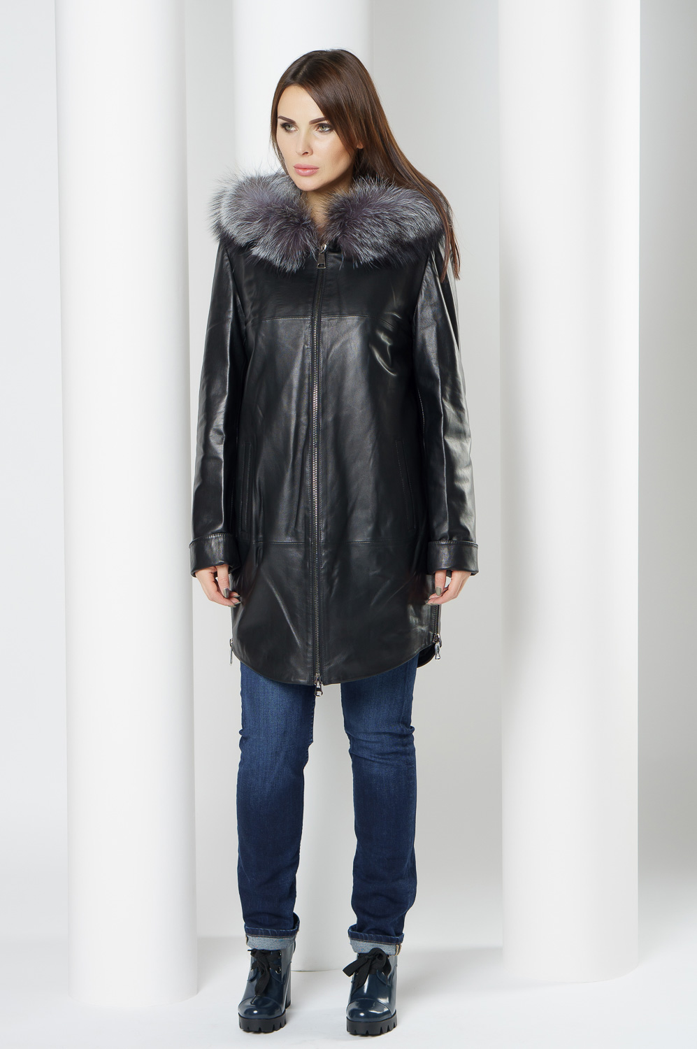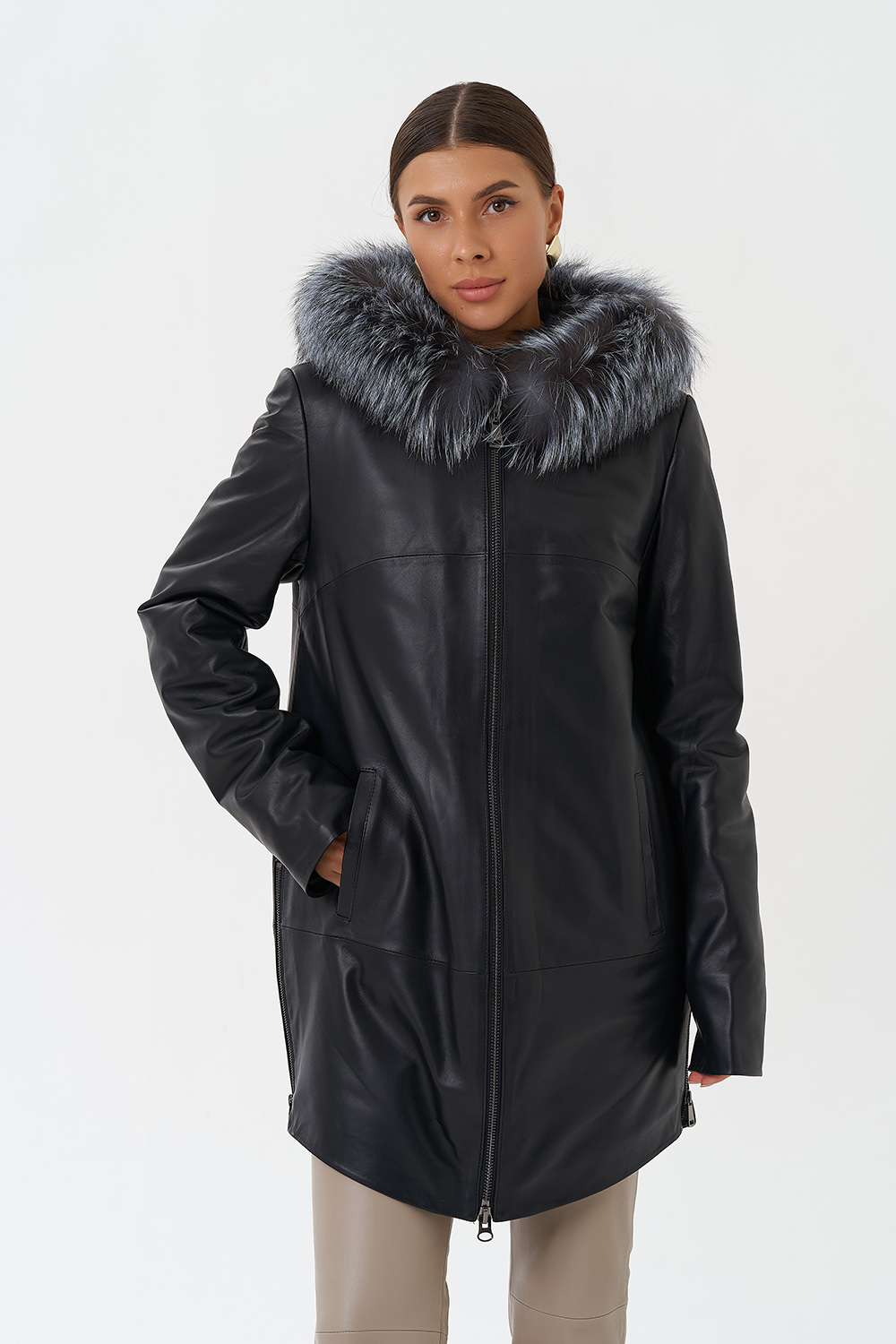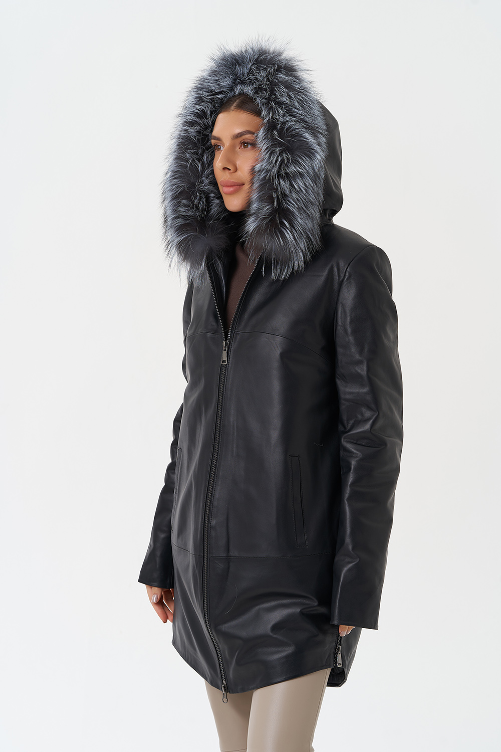 Утепленное пальто из натуральной кожи украсит ваши дождливые будни. Капюшон с отделкой из меха чернобурки согреет в ветреную погоду. Удобный фасон позволит совершать длинные прогулки. Утеплитель обеспечит комфортное пребывание на улице. С помощью молний по бокам изделия вы можете отрегулировать низ модели.