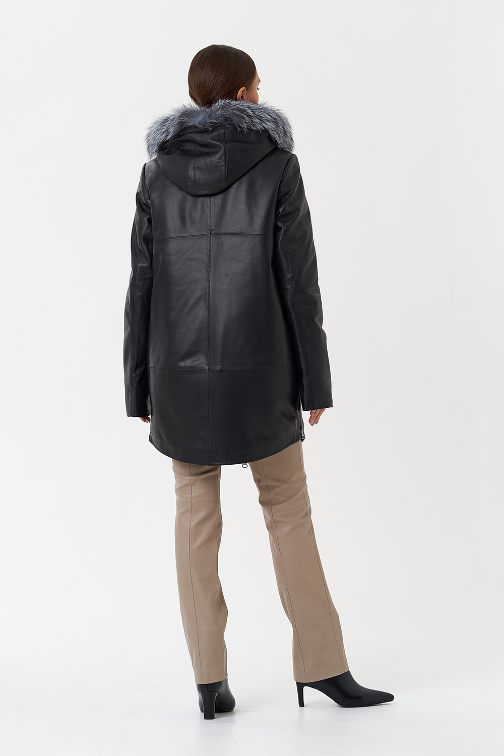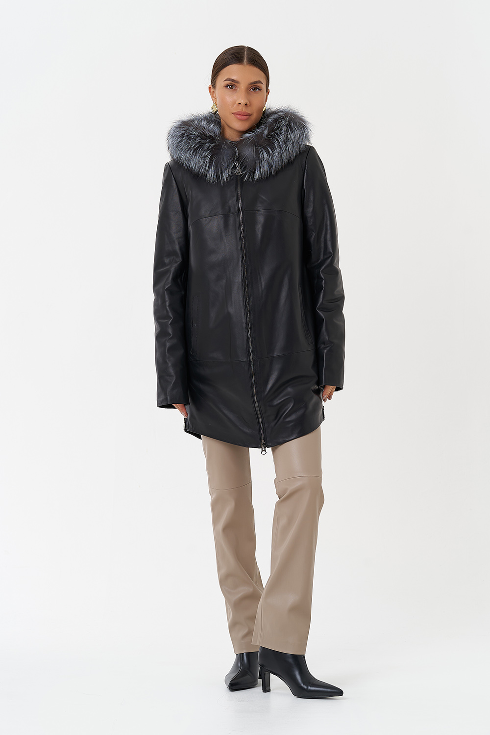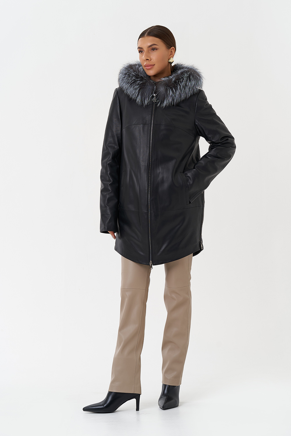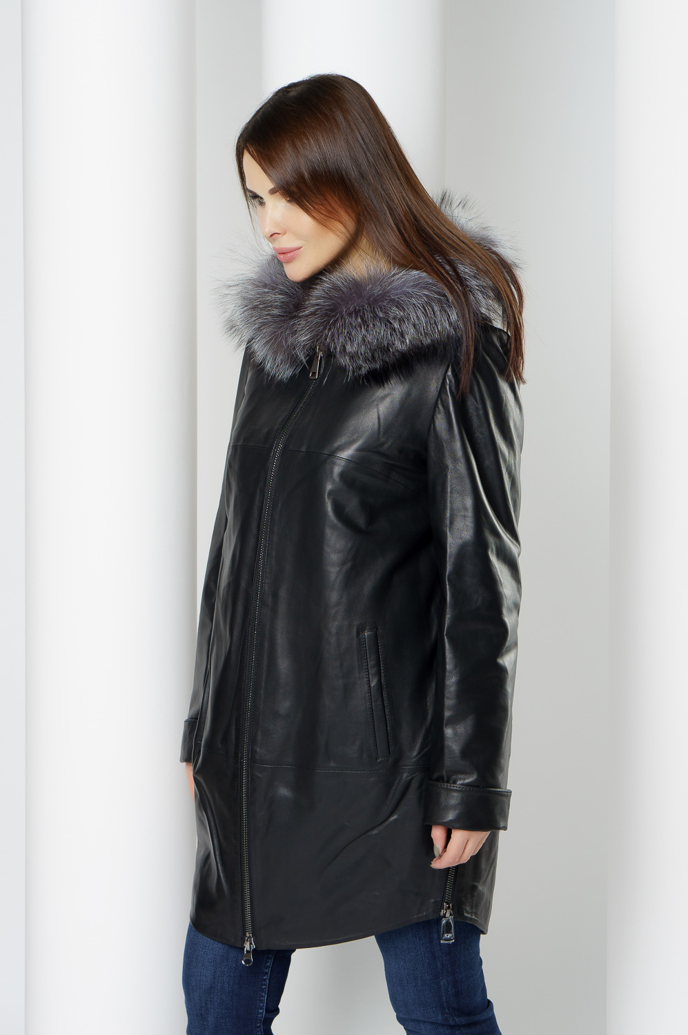 Утепленное пальто из натуральной кожи украсит ваши дождливые будни. Капюшон с отделкой из меха чернобурки согреет в ветреную погоду. Удобный фасон позволит совершать длинные прогулки. Утеплитель обеспечит комфортное пребывание на улице. С помощью молний по бокам изделия вы можете отрегулировать низ модели.