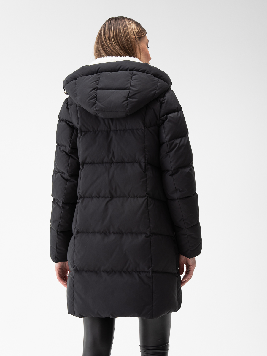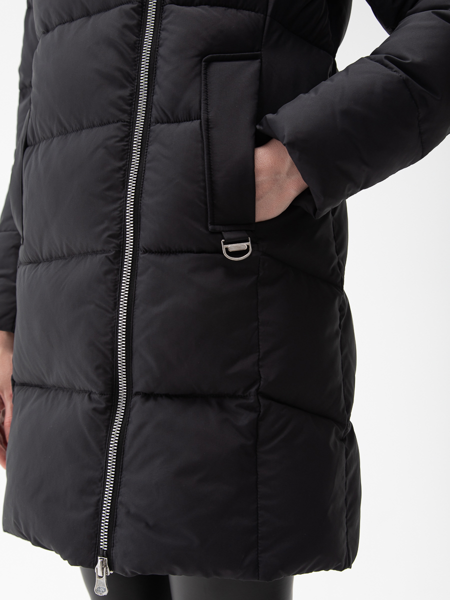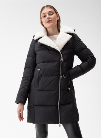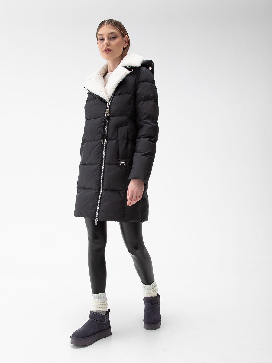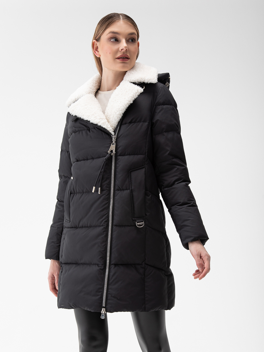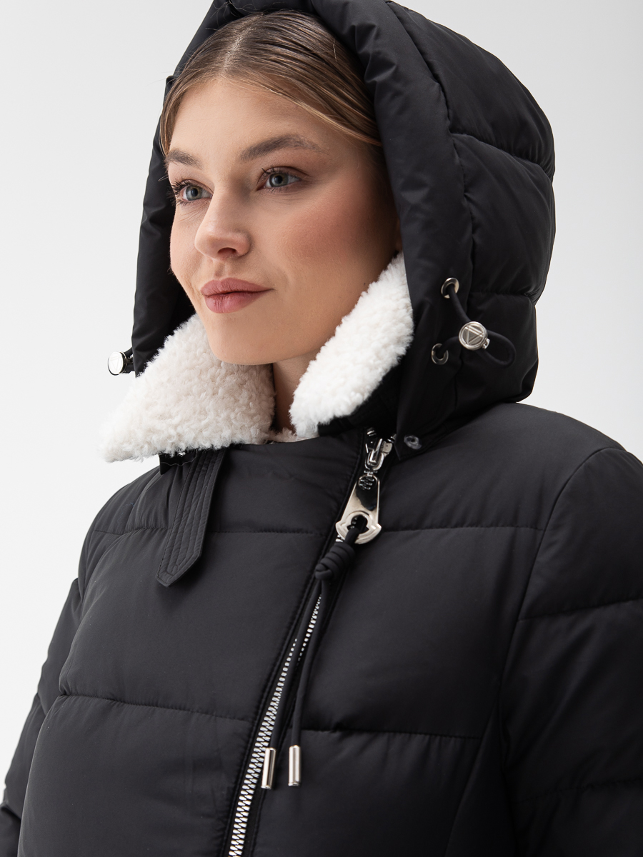 Крой воротника - съёмный капюшон, отделка эко мех