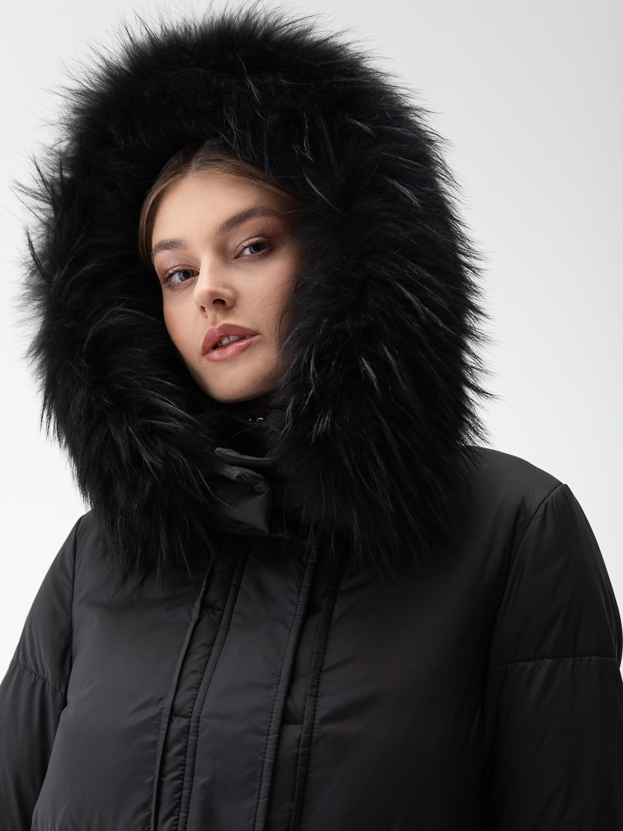Крой воротника - съёмный капюшон, отделка енот