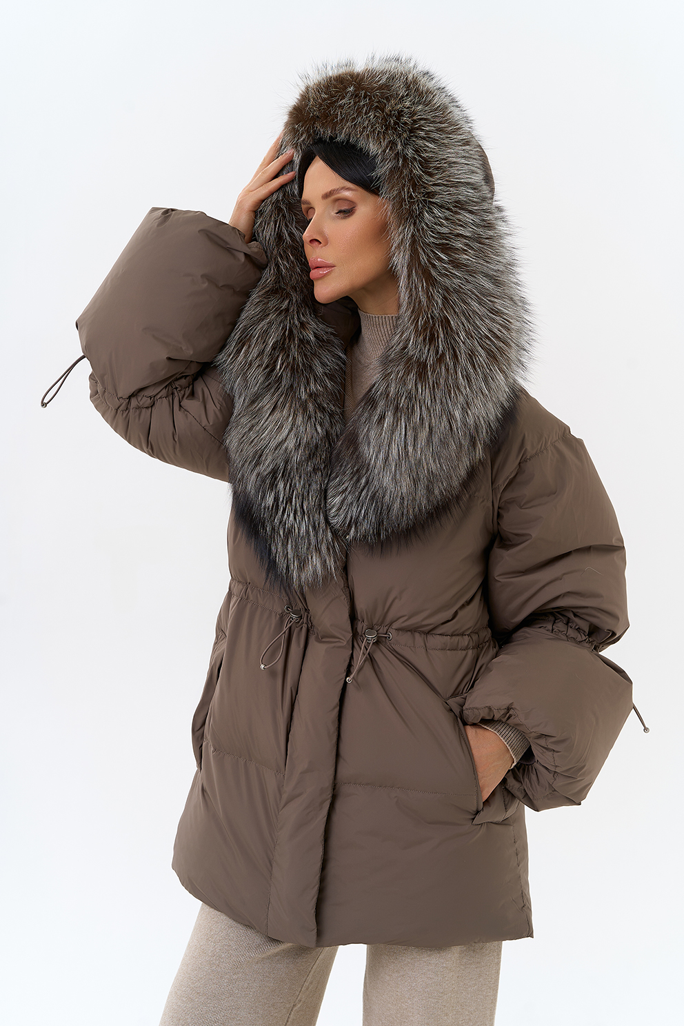 Крой воротника - капюшон, отделка чернобурка