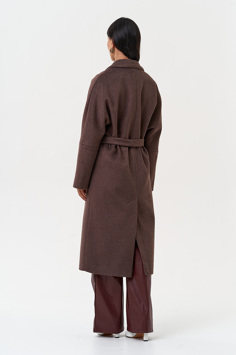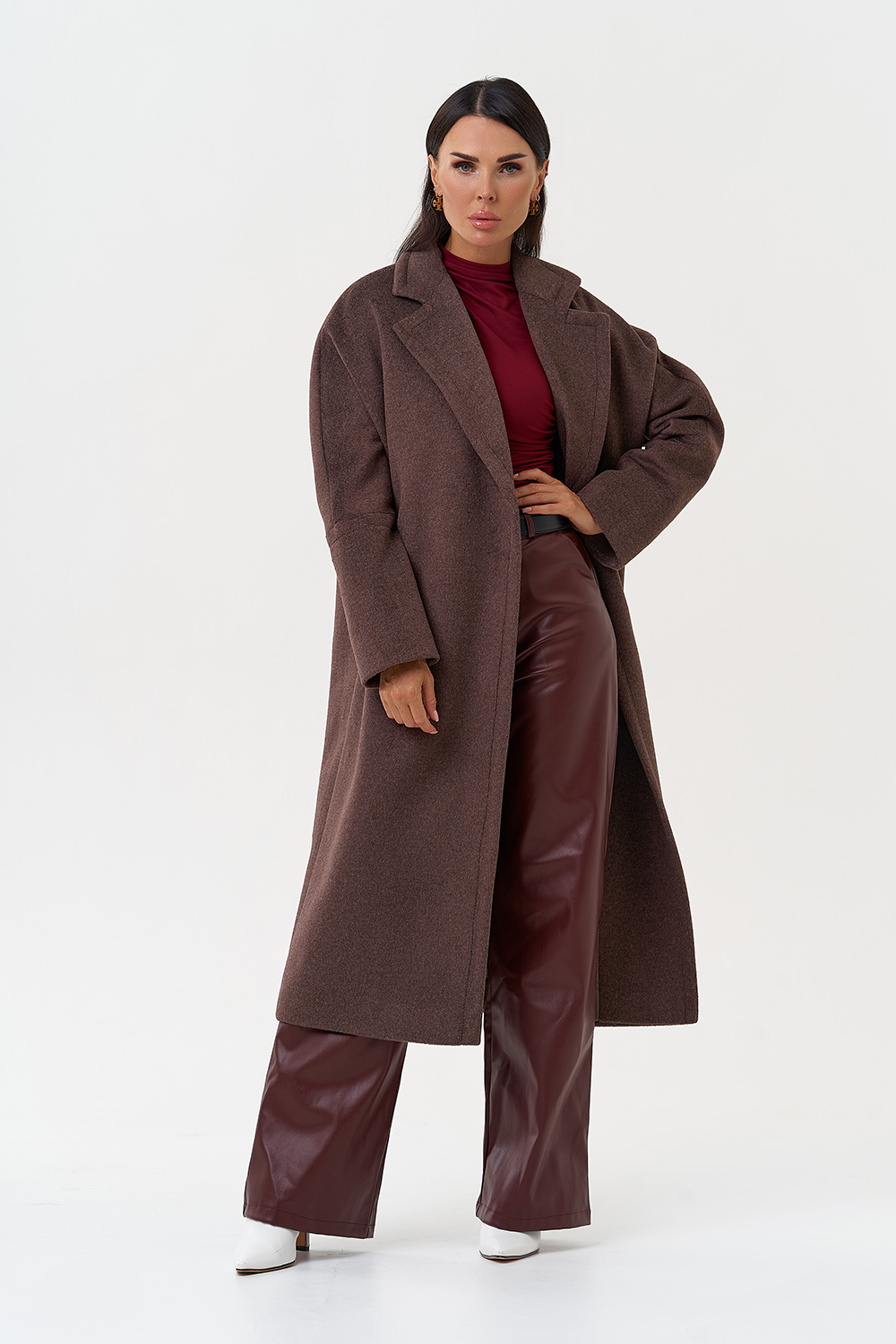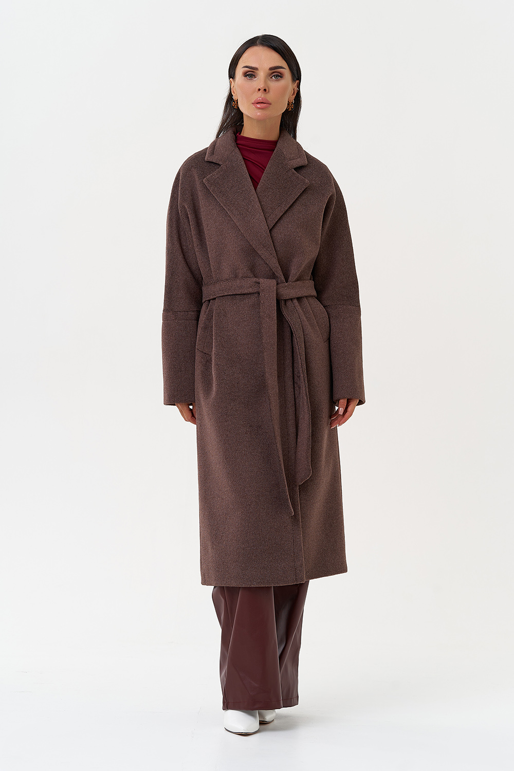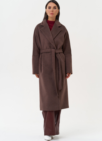 Силуэт - прямой Цвет - коричневый Длина - 115 см Вид полотна - тканое Состав полотна - шерсть 80%, п/э 20% Вид застежки - кнопки Крой воротника - английский воротник Фасон рукава - спущенное плечо, длинный Фасон кармана - прорезной Пояс |