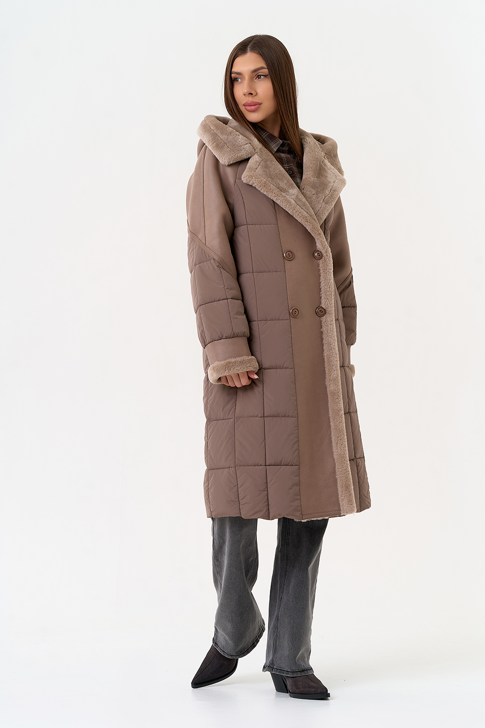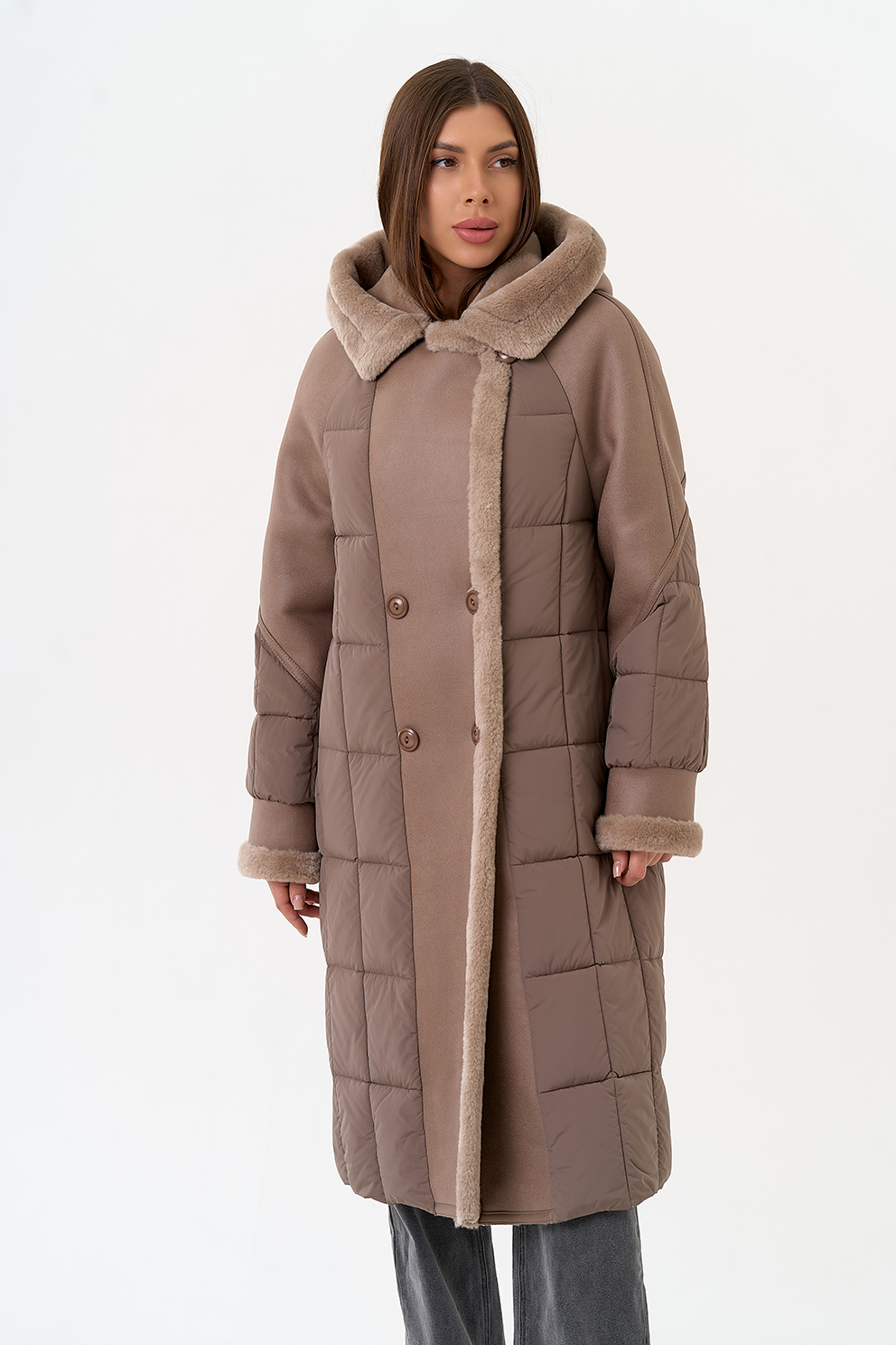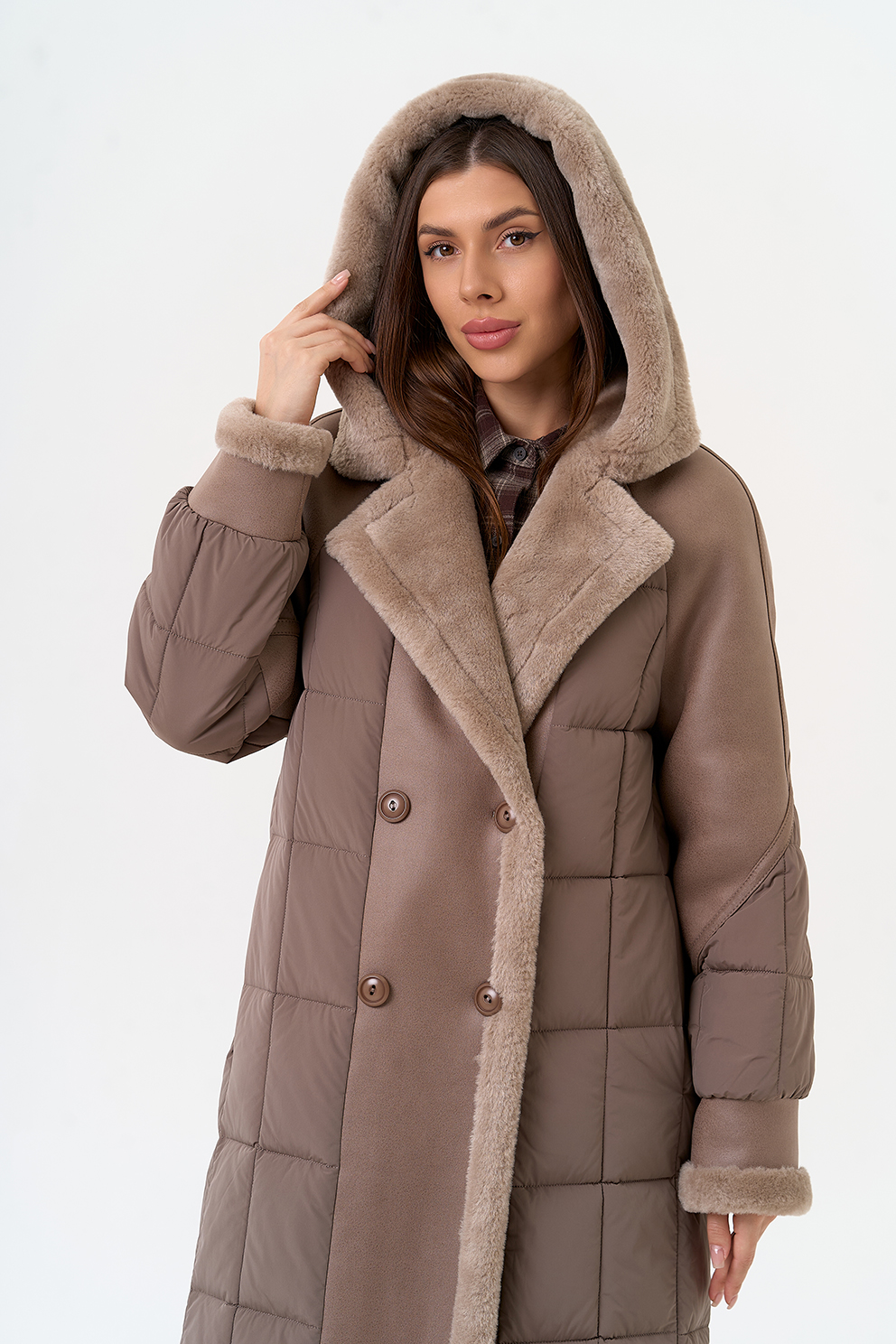 Крой воротника - капюшон, отделка эко мех
