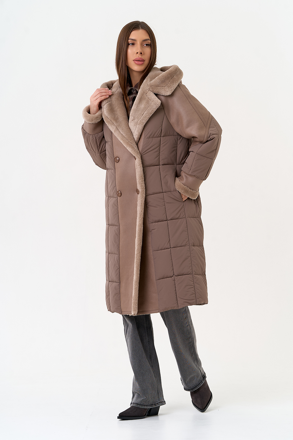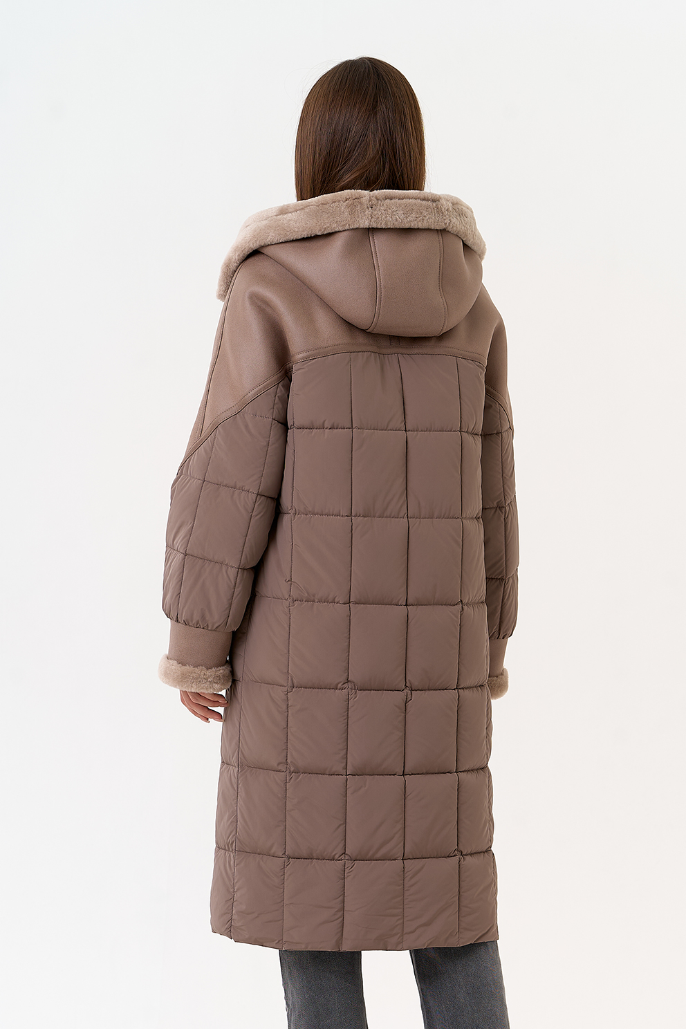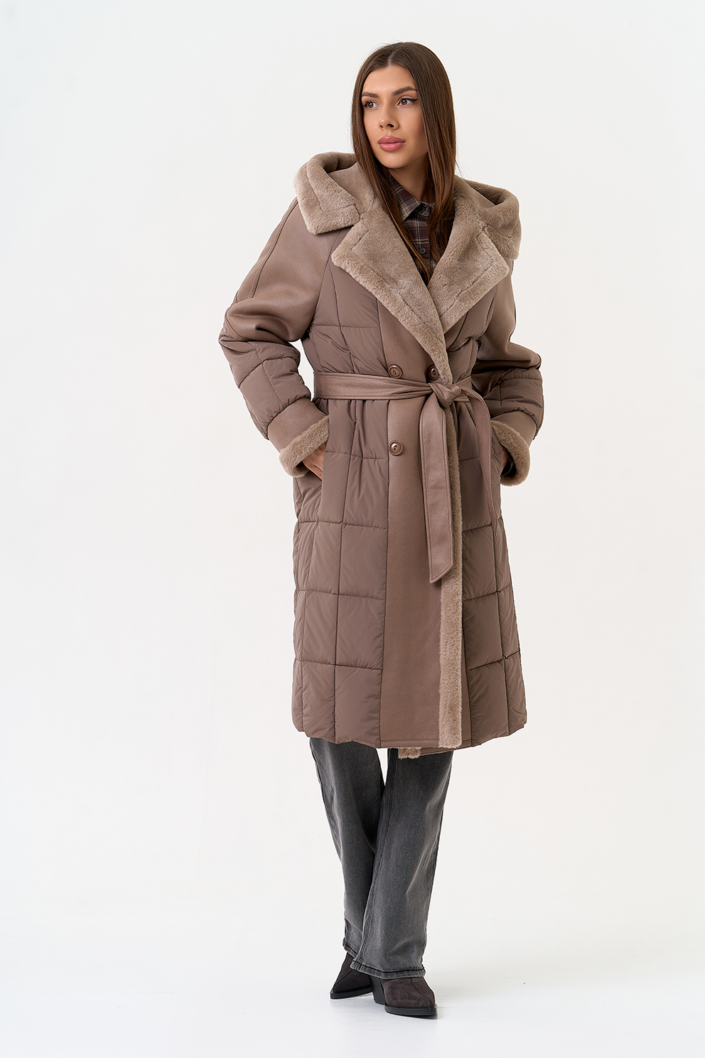 Крой воротника - капюшон, отделка эко мех