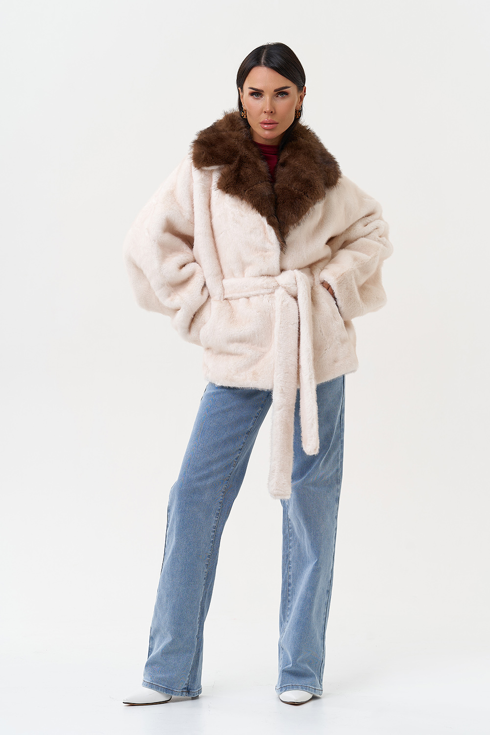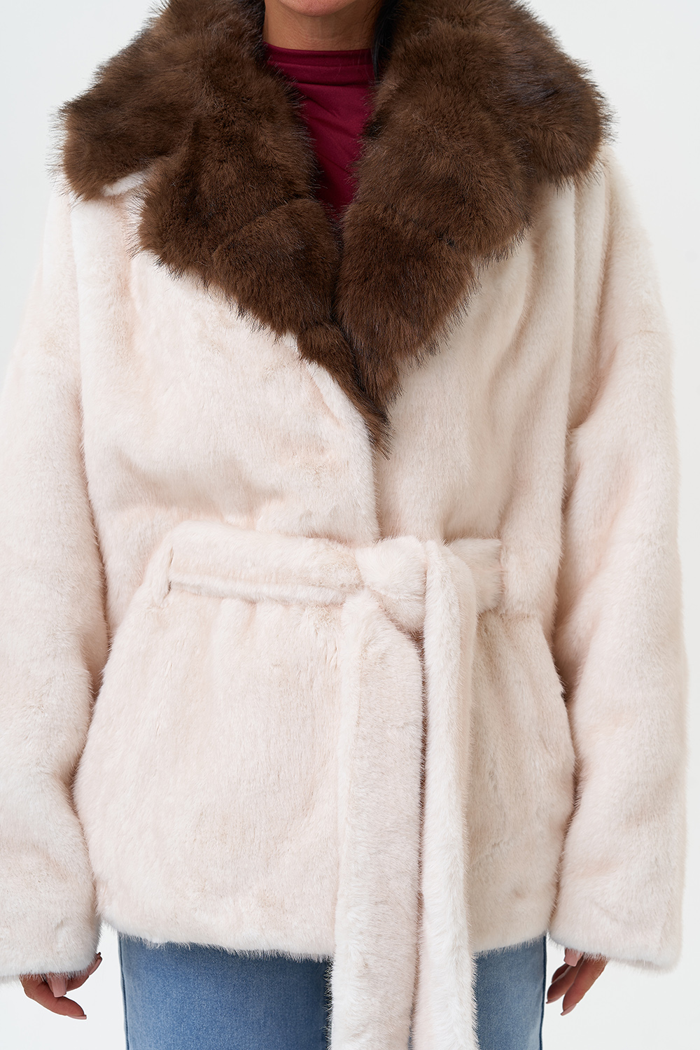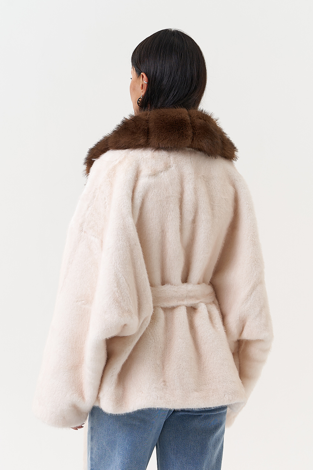 Фасон - прямой Длина изделия - 65 см Цвет - светло-бежевый Материал - экомех Состав полотна - полиэстер 100% Подкладка - полиэстер 100% Вид застежки -крючки, пояс Вид ворота - английский воротник Фасон рукава - спущенное плечо, длинный |