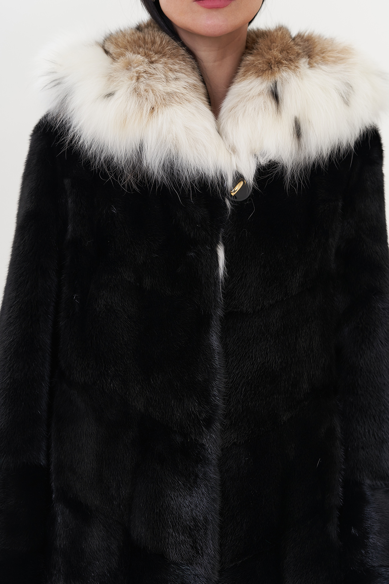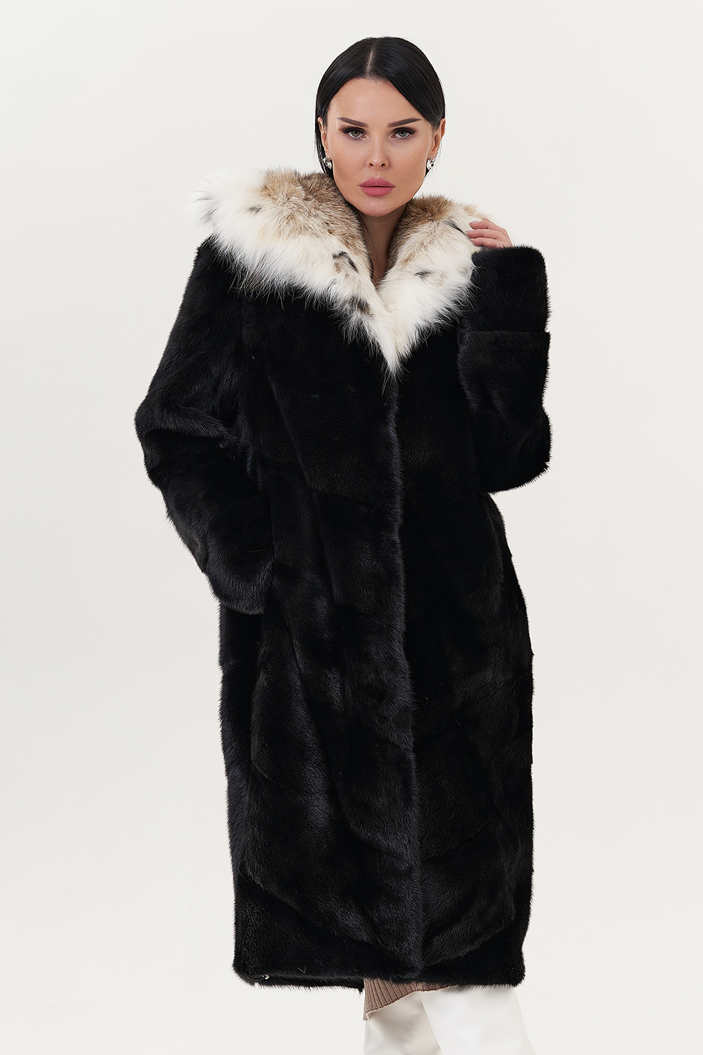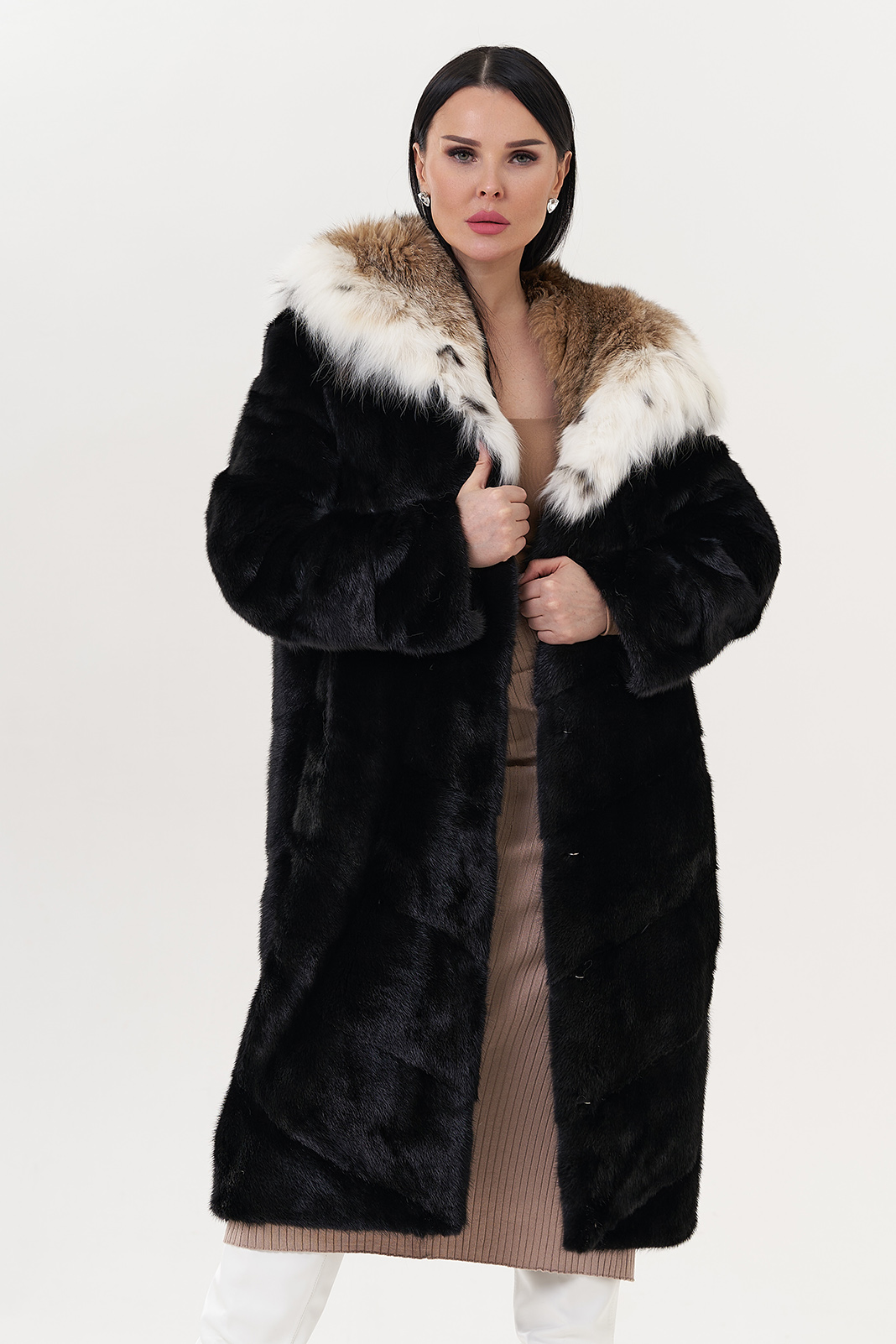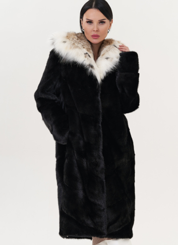 Модель украшает капюшон с отделкой из меха рыси. Мех норки черного цвета
