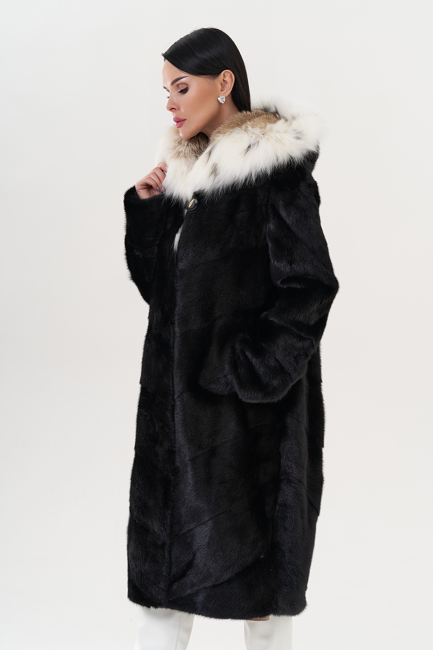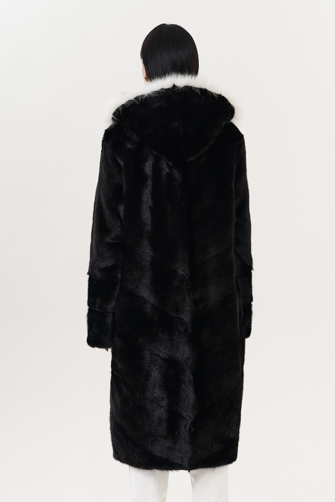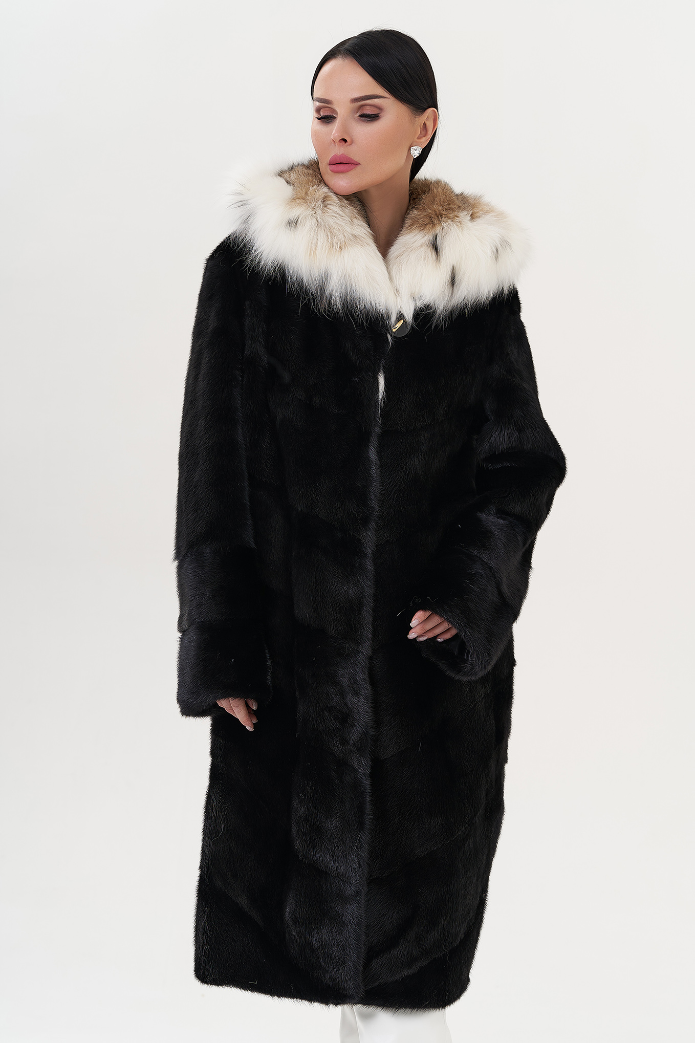 Модель украшает капюшон с отделкой из меха рыси. Мех норки черного цвета