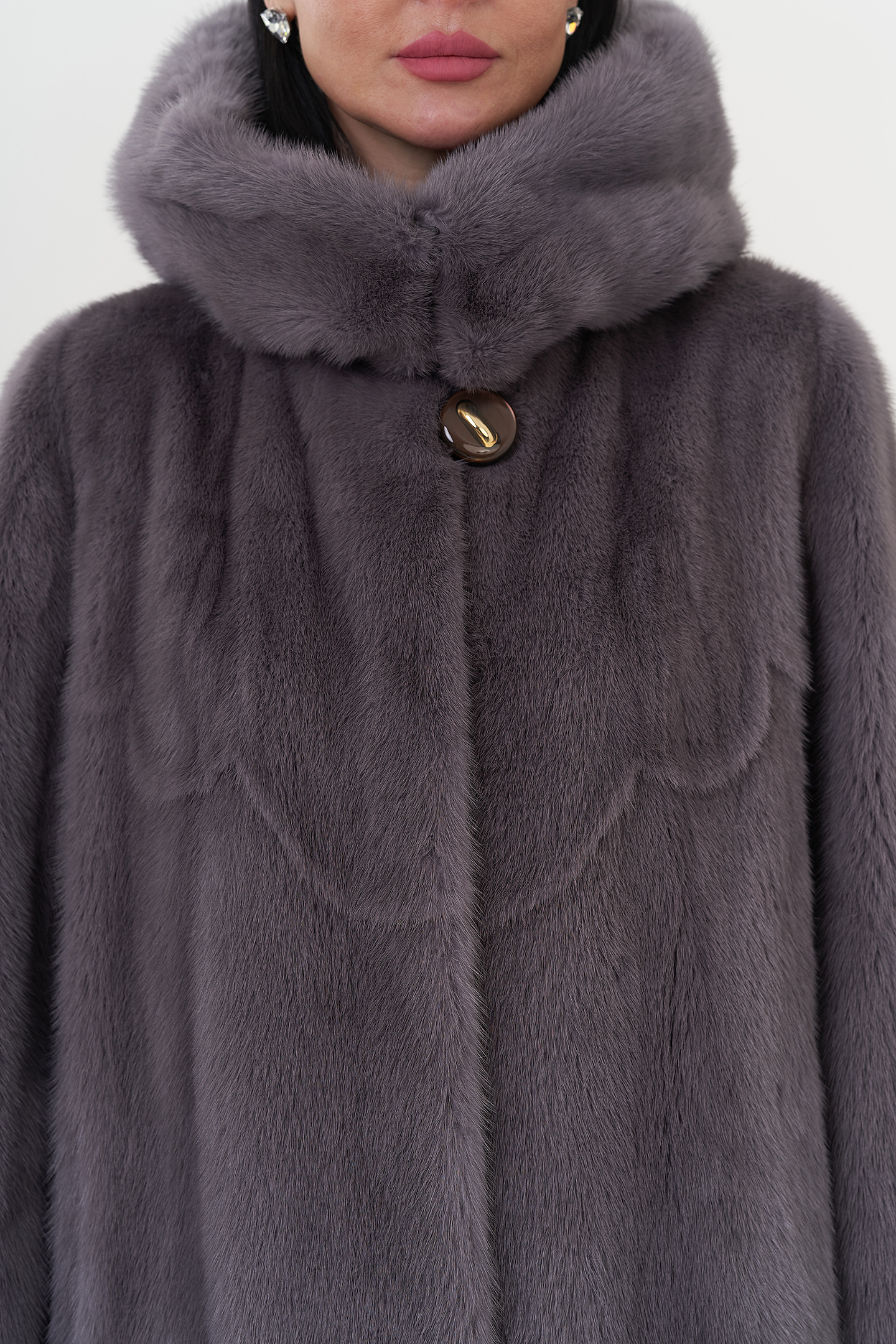 Норковая шуба с капюшоном в фиолетовом цвете.